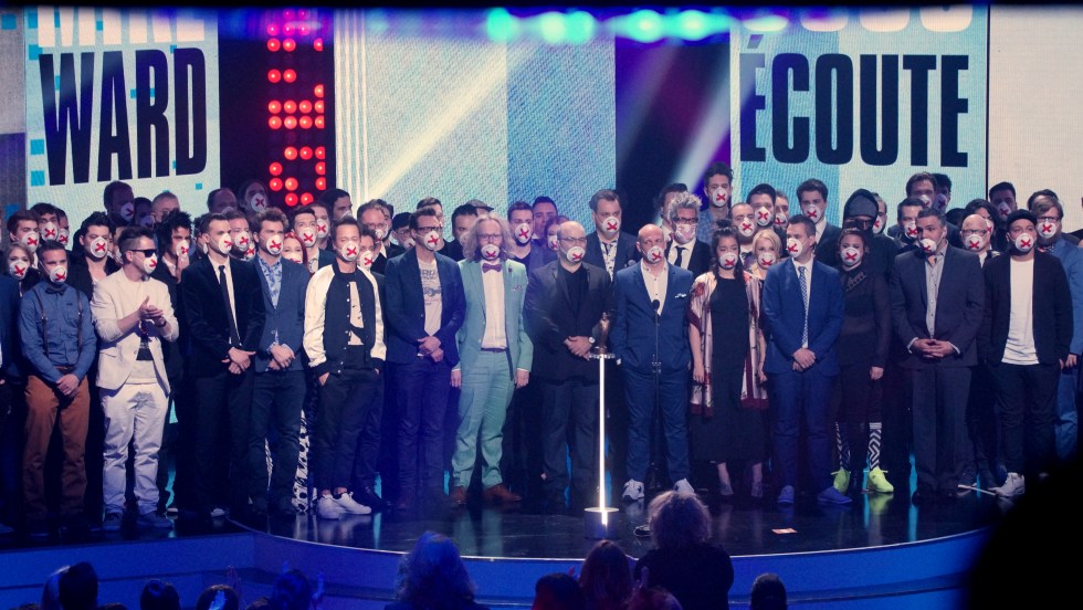 Plusieurs humoristes se sont ralliés derrière Mike Ward et Guy Nantel dimanche soir au Gala Les Olivier en arrivant tous ensemble, un masque sur la bouche décoré d’un X rouge.