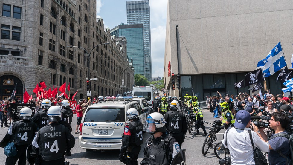 MONTRÉAL — Les groupes de droite identitaire La Meute et Storm Alliance se sont rassemblés un peu avant 13 h, dimanche devant les bureaux de Citoyenneté et Immigration Canada à