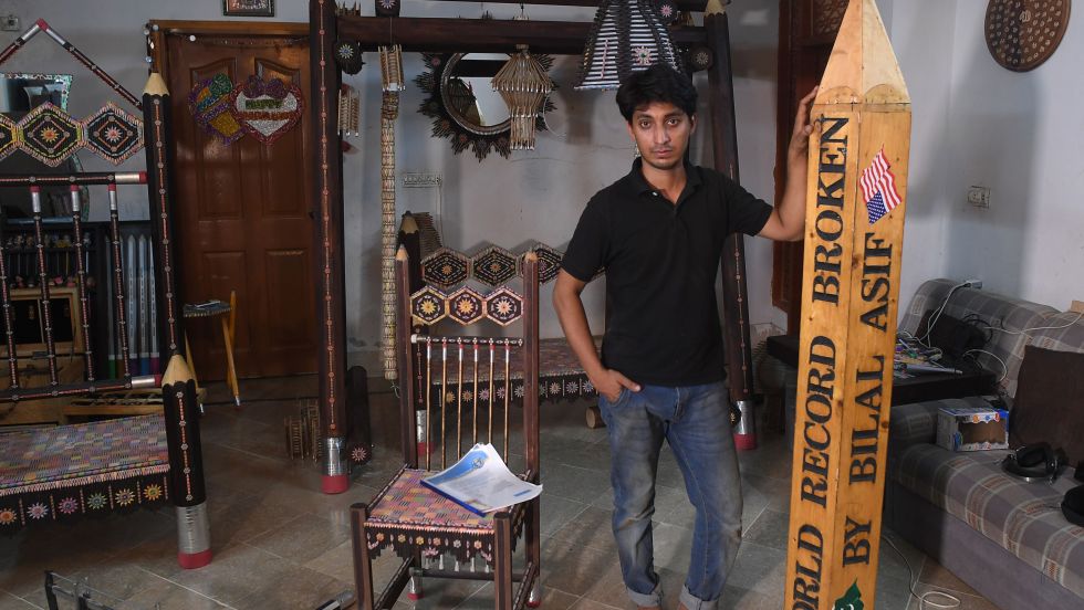 L’œil aussi affûté que la mine de ses milliers d’accessoires, Bilal Asif travaille avec soin à sa création, qu’il espère faire homologuer comme record du monde: la construction d’une balancelle