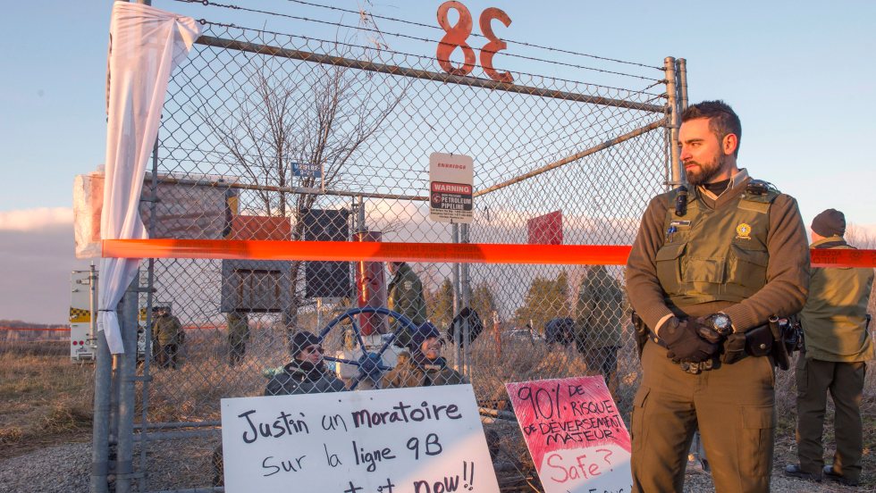 MONTRÉAL – Les trois manifestants qui avaient fermé une valve du pipeline 9B d’Enbridge, à Sainte-Justine-de-Newton sur la frontière entre l’Ontario et le Québec, pour ensuite s’y enchaîner à bonne