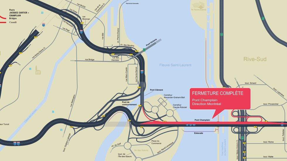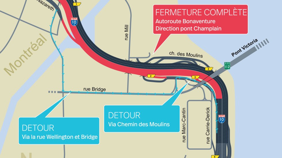 La fermeture complète prévue ce soir aura lieu demain. Les automobilistes ne pourront pas emprunter l’autoroute Bonaventure en direction du pont Champlain de 22h à 5h dans la nuit du