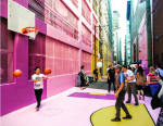 Cette ruelle est devenue la toile de fond d’une œuvre d’art colossale qui s’étend jusque sur les murs des édifices adjacents, créant ainsi un véritable effet de surprise auprès des passants. Des paniers de basketball ont été installés pour les jeunes du quartier alors que l’éclairage a été bonifié pour accroître le sentiment de sécurité. Du mobilier incluant quelques tables et chaises de type bistro s’insère aussi dans le décor. Des discussions sont d’ailleurs en cours avec deux cafés longeant la ruelle afin d’installer des terrasses complètes, ce qui permettrait d’activer le lieu sur une base quotidienne.