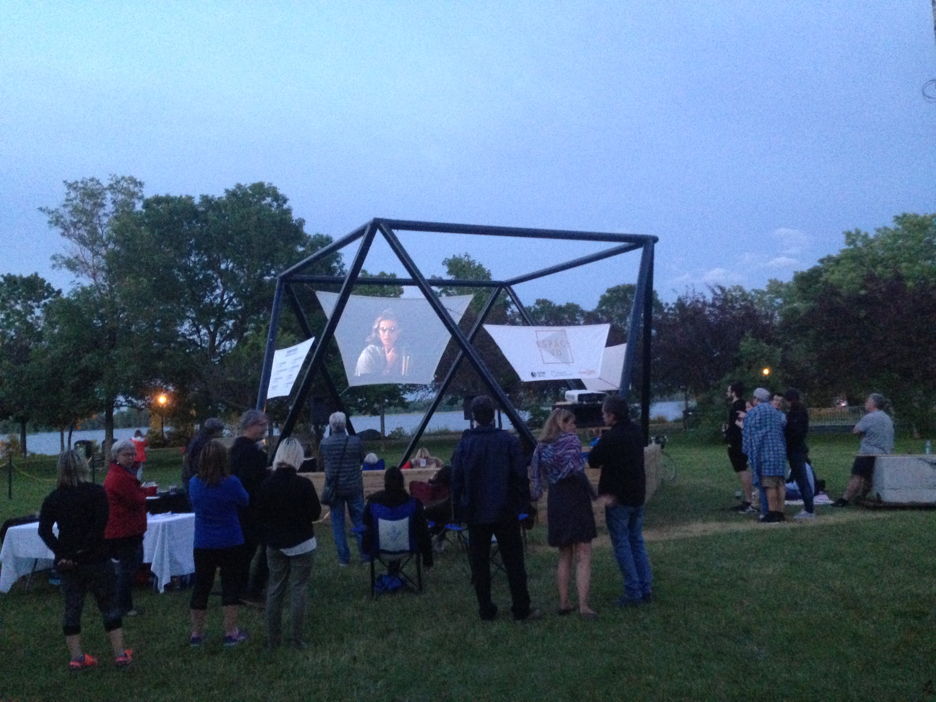 Le pavillon estival Espace Vu, créé par Maude Turner et Dominic Dubé, diplômés en design, est muni de banc et d’un écran de projection translucide en toiles, qui permet aux gens de se rassembler pour visionner un film à la belle étoile.