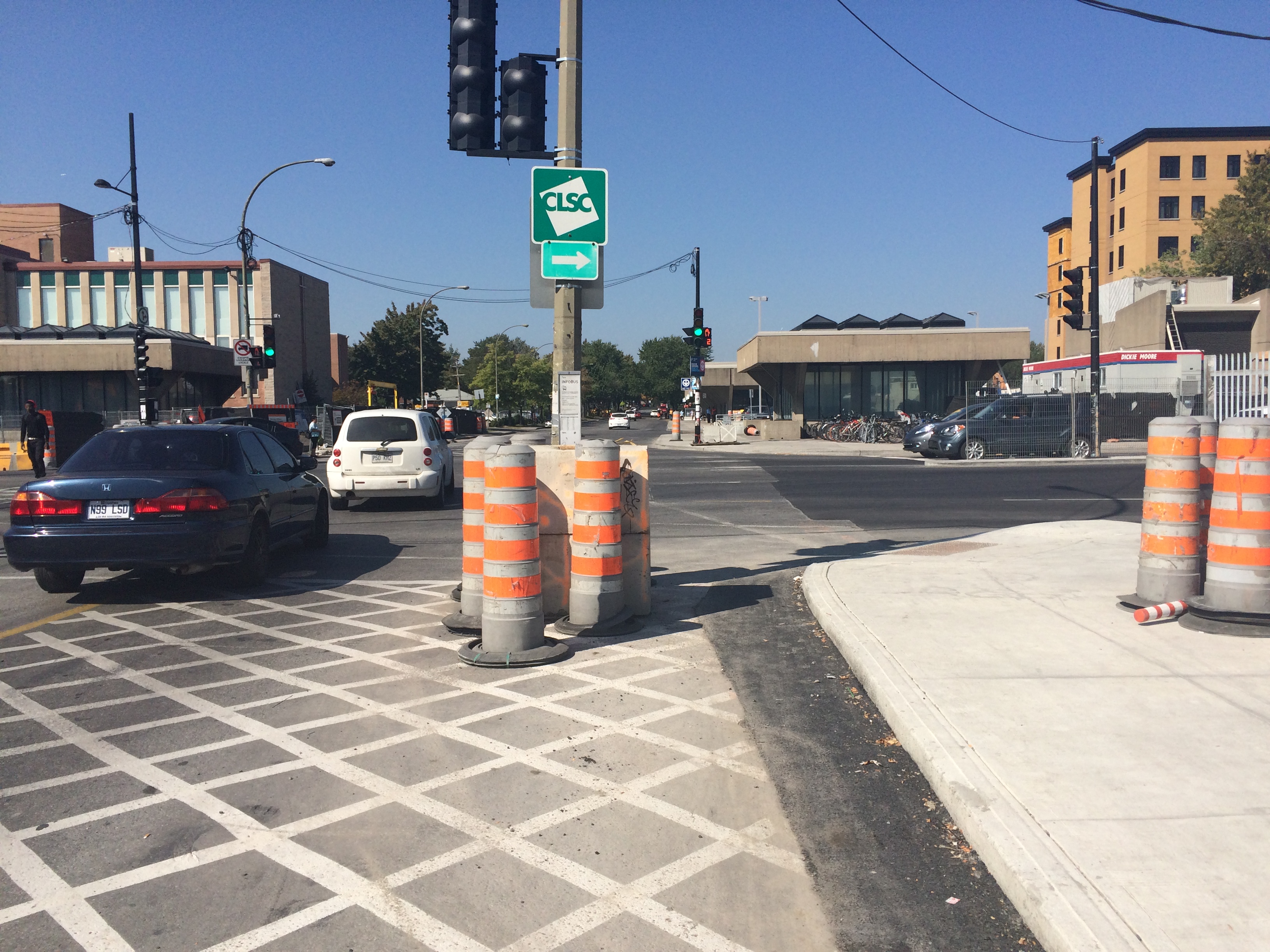 En raison de travaux exécutés par la Société de transport de Montréal (STM), le feu de circulation a été placé à plus d’un mètre du trottoir, soit sur la voie publique.