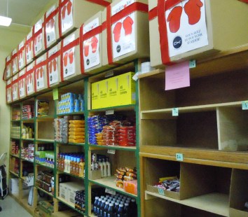 Produits et denrées non périssables tels que: pâtes alimentaires, sauce à spaghetti, poisson en boîtes, fèves au lard, soupes, fruits en conserve, biscuits, céréales, gruau, farine, riz, confitures, beurre d’arachide, sucre, café, thé, chocolat chaud, jus, produits d’hygiène, couches et autres semblables.