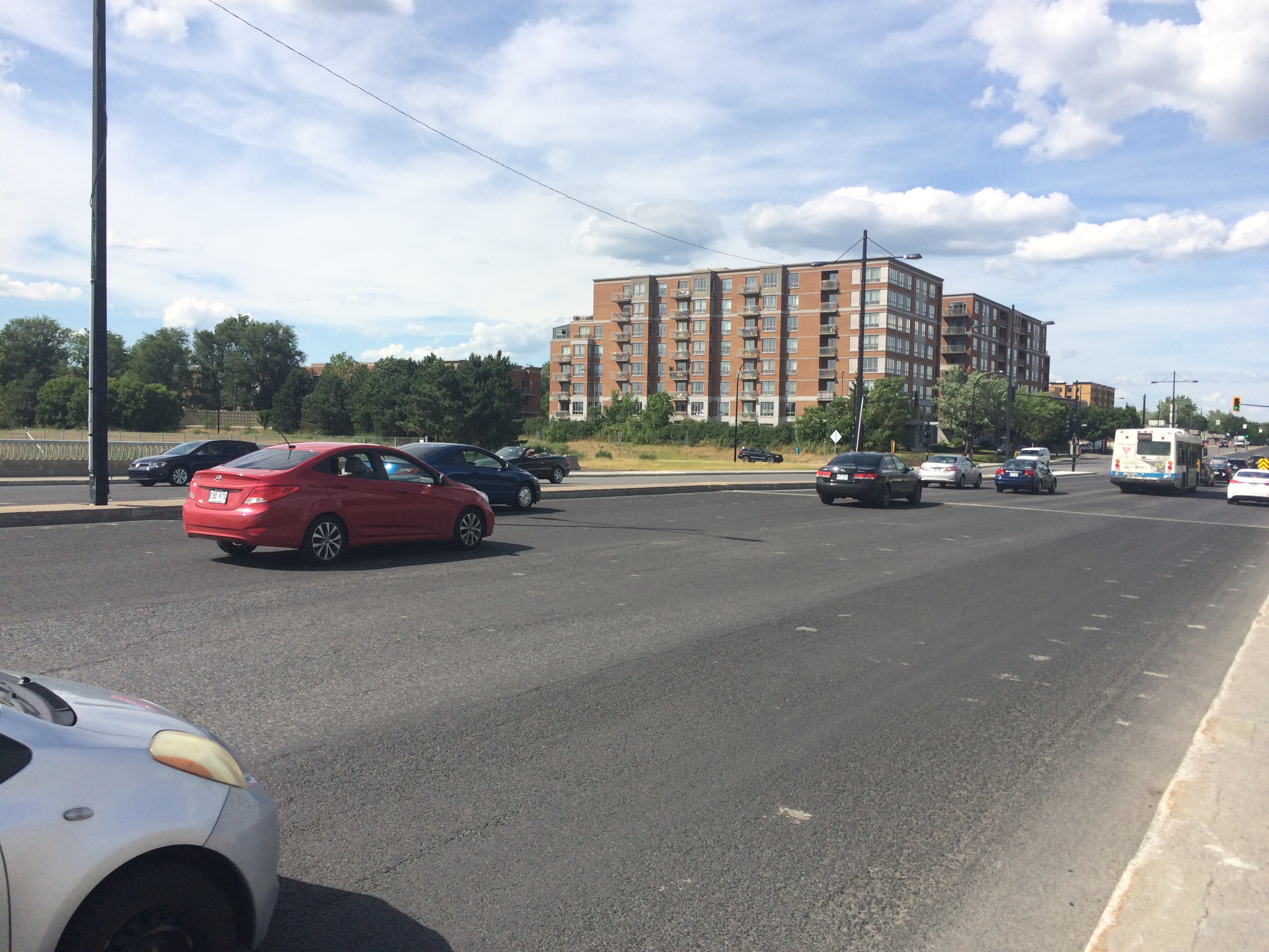La zone de croisement en direction est avec les autobus et automobiles de la bretelle double en arc qui remplace l’ancienne bretelle simple pour aller en direction du tunnel Louis-H.-La Fontaine sera réduite à 31 mètres plutôt que 80 mètres.