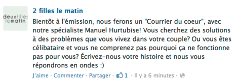 Ce matin en perdant du temps sur Facebook, je suis tombée sur le statut de l’émission 2 filles le matin que vous pouvez voir ci-haut: « Bientôt à l’émission, nous ferons un « Courrier du coeur », avec notre spécialiste Manuel Hurtubise! Vous cherchez des solutions à des problèmes que vous vivez dans votre couple? Ou vous êtes célibataire et vous ne comprenez pas pourquoi ça ne fonctionne pas pour vous? Écrivez-nous votre histoire et nous vous répondrons en ondes 🙂 »