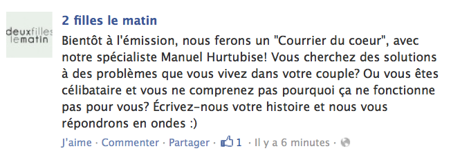 Ce matin en perdant du temps sur Facebook, je suis tombée sur le statut de l’émission 2 filles le matin que vous pouvez voir ci-haut: « Bientôt à l’émission, nous ferons un « Courrier du coeur », avec notre spécialiste Manuel Hurtubise! Vous cherchez des solutions à des problèmes que vous vivez dans votre couple? Ou vous êtes célibataire et vous ne comprenez pas pourquoi ça ne fonctionne pas pour vous? Écrivez-nous votre histoire et nous vous répondrons en ondes 🙂 »