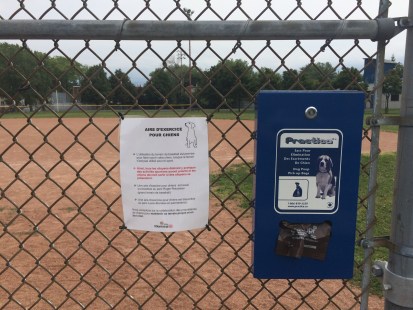 À l’entrée du parc, une affiche invite clairement les propriétaires de chien à maintenir le terrain propre et en bon état. Des sacs pour ramasser les besoins des chiens sont à la disposition des gens. Malgré tout, certains propriétaires semblent ne pas s’en soucier.