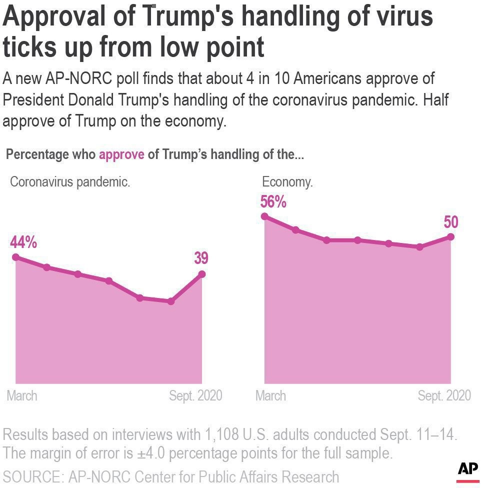 L’argumentaire de M. Trump à l’endroit des électeurs repose en partie sur la persuasion des Américains que la pandémie retraite après avoir causé la mort de près de 200 000 personnes aux États-Unis. Pourtant, seulement 39% des Américains approuvent la façon avec laquelle M. Trump gère la situation de la COVID-19.