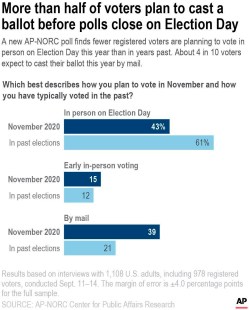 Parmi tous les électeurs inscrits, 39 % disent qu’ils voteront par correspondance, ce qui est bien supérieur aux 21 % qui se déplaceront dans les bureaux de scrutin, selon un nouveau sondage de l’Associated Press-NORC Center for Public Affairs Research.
