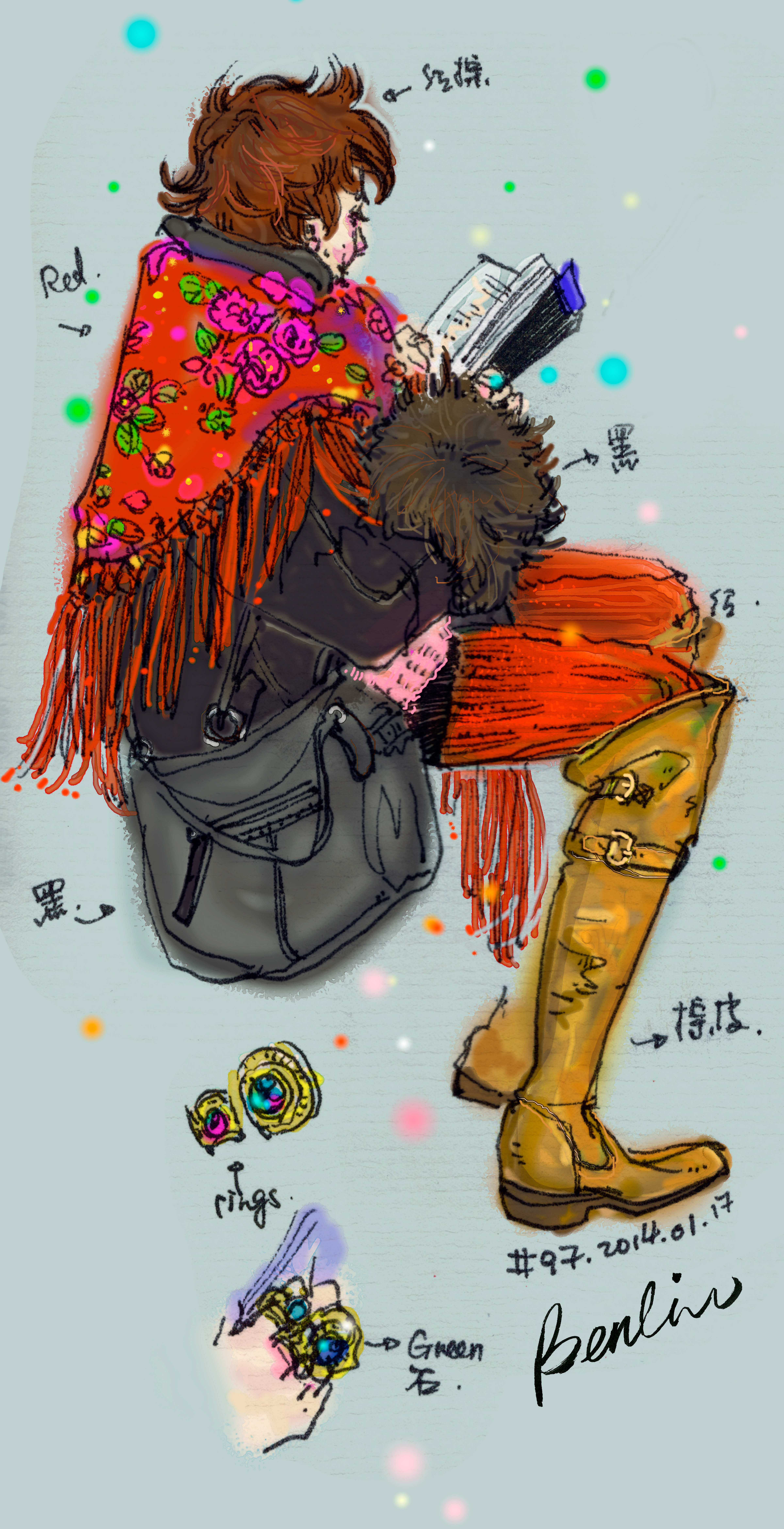 Puis cette chère dame colorée de l’autobus 97 a littérairement changé mon avis : sa pèlerine rouge feu et ses cheveux de flammes m’ont fait penser à une scène familière…