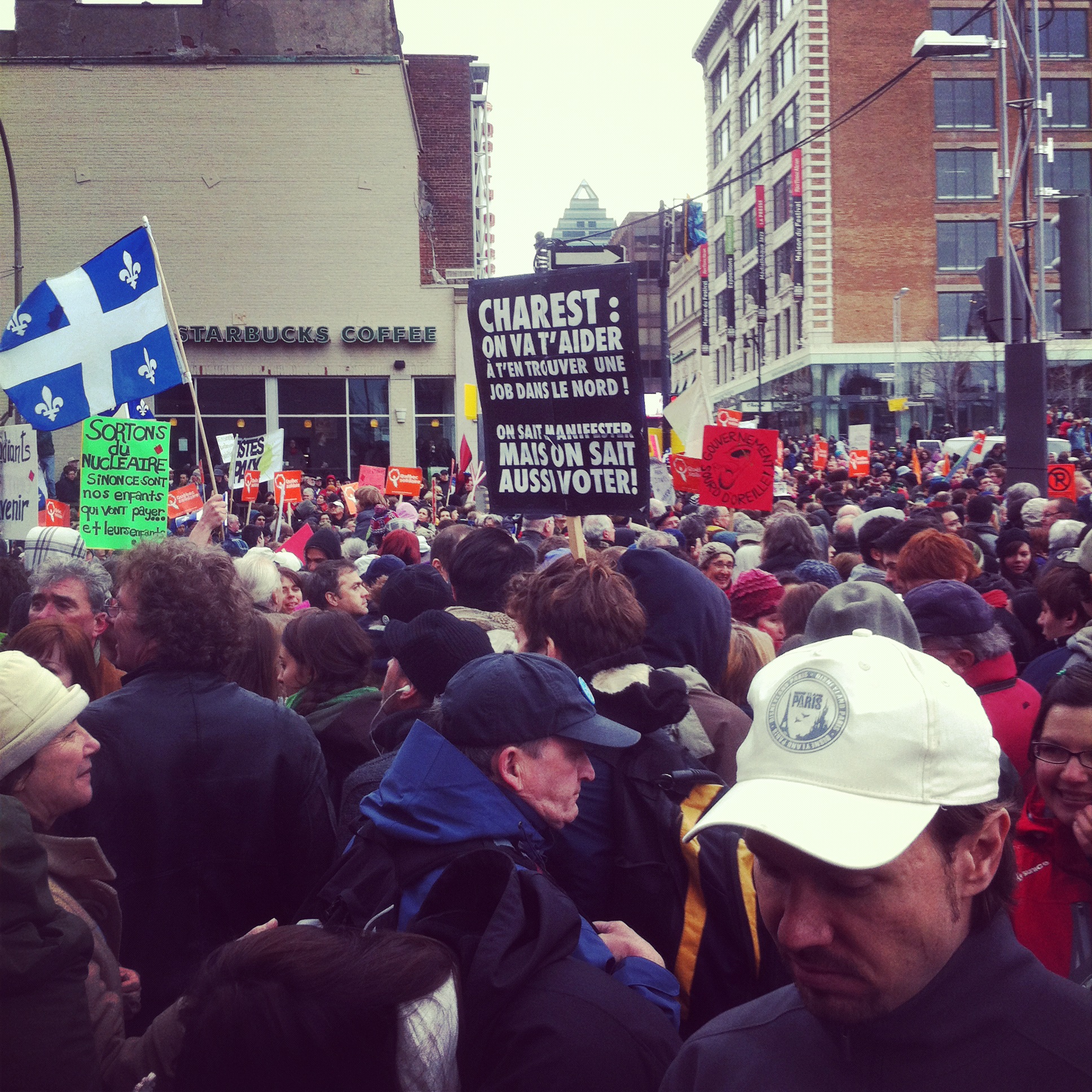 On estime à 300 000 le nombre de citoyens venus marcher dimanche dernier à la marche du Jour de la Terre. Que ce soit pour dire non au Plan Nord, simplement pour en conscientiser d’autres sur le climat politique tendu au Québec actuellement ou juste pour prendre une bonne marche de santé avec «pitou» et les enfants, plusieurs marcheurs engagés de partout au Québec ont décidé de venir faire un tour à Montréal. Certains médias en ont parlé un peu, d’autres pas du tout, ce qui a d’ailleurs causé un peu de bisbille le lendemain matin en comparant les premières pages des quotidiens. Peu importe, une seule question subsiste… Et vous y étiez-vous? Trouvez-vous sur une de ces photos et gagnez… Tout notre respect!