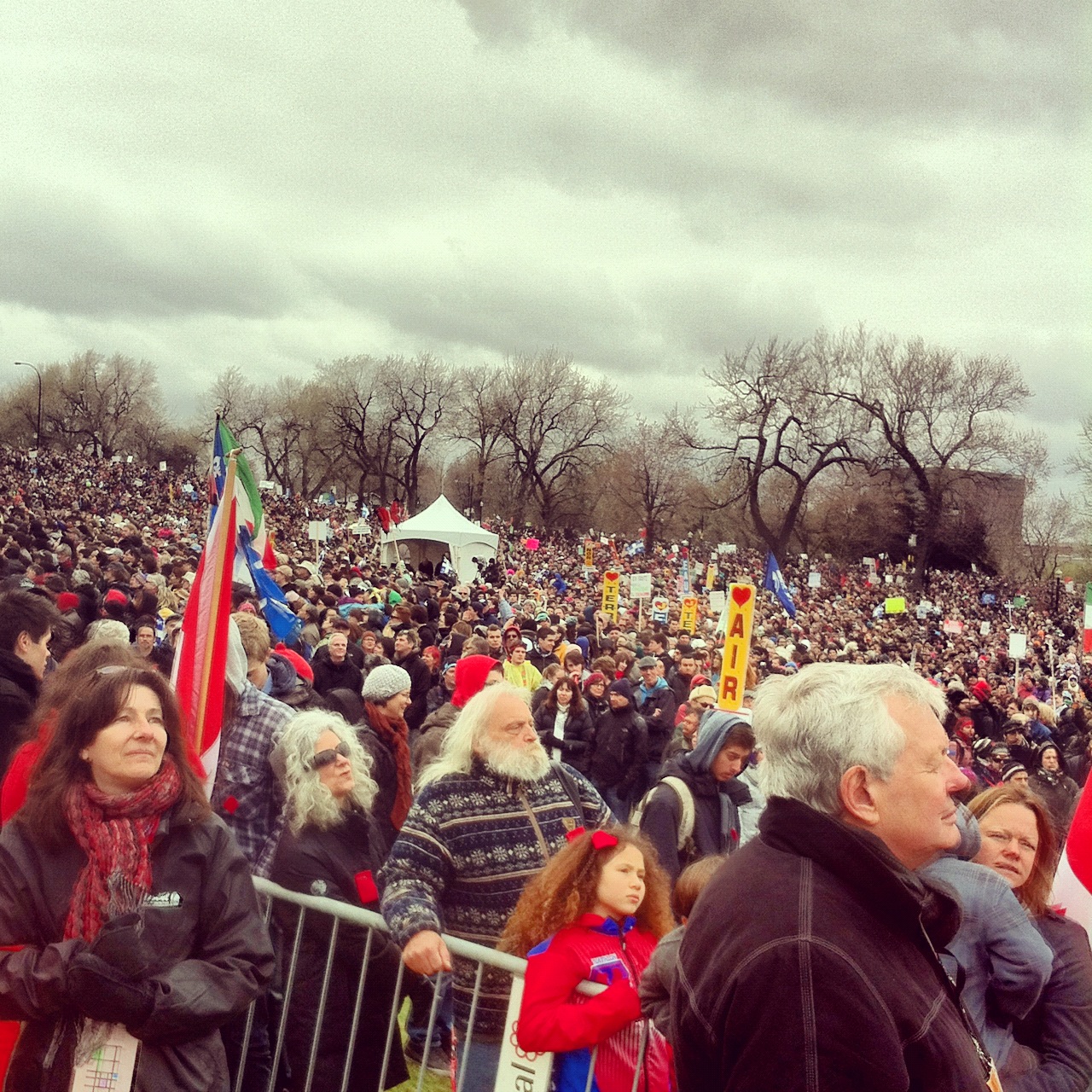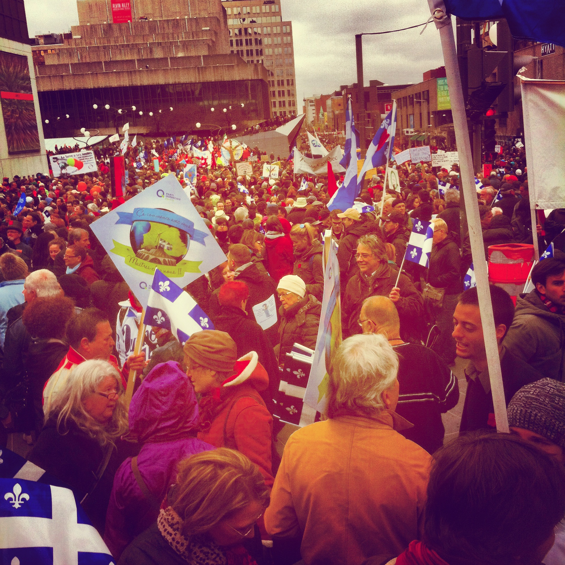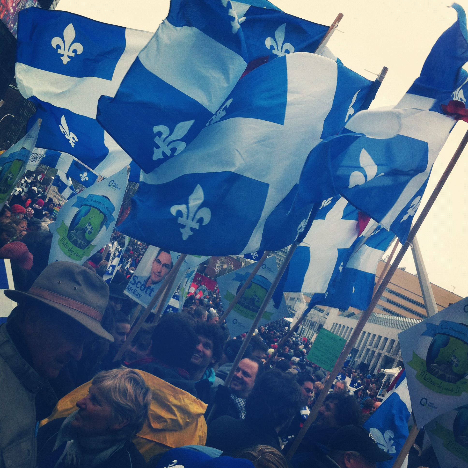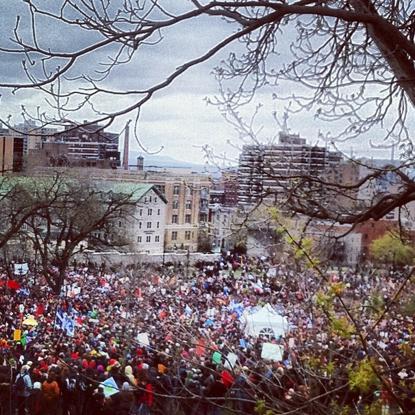 On estime à 300 000 le nombre de citoyens venus marcher dimanche dernier à la marche du Jour de la Terre. Que ce soit pour dire non au Plan Nord, simplement pour en conscientiser d’autres sur le climat politique tendu au Québec actuellement ou juste pour prendre une bonne marche de santé avec «pitou» et les enfants, plusieurs marcheurs engagés de partout au Québec ont décidé de venir faire un tour à Montréal. Certains médias en ont parlé un peu, d’autres pas du tout, ce qui a d’ailleurs causé un peu de bisbille le lendemain matin en comparant les premières pages des quotidiens. Peu importe, une seule question subsiste… Et vous y étiez-vous? Trouvez-vous sur une de ces photos et gagnez… Tout notre respect!