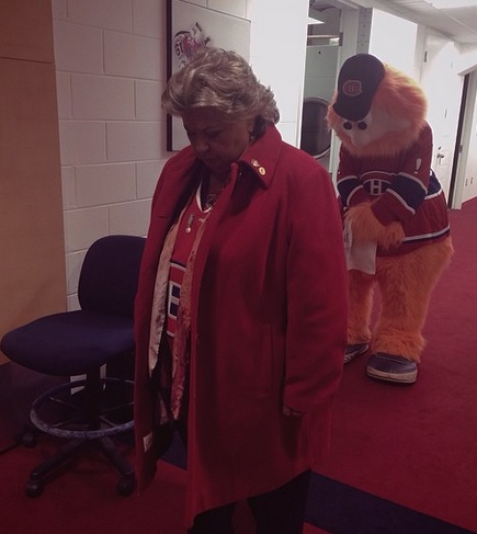 Bref, je tenais à vous partager cette belle photo (que vous ne verrez pas dans le Journal) de notre Ginette, accompagnée de Youppi, quelques minutes avant son interprétation des hymnes nationaux.