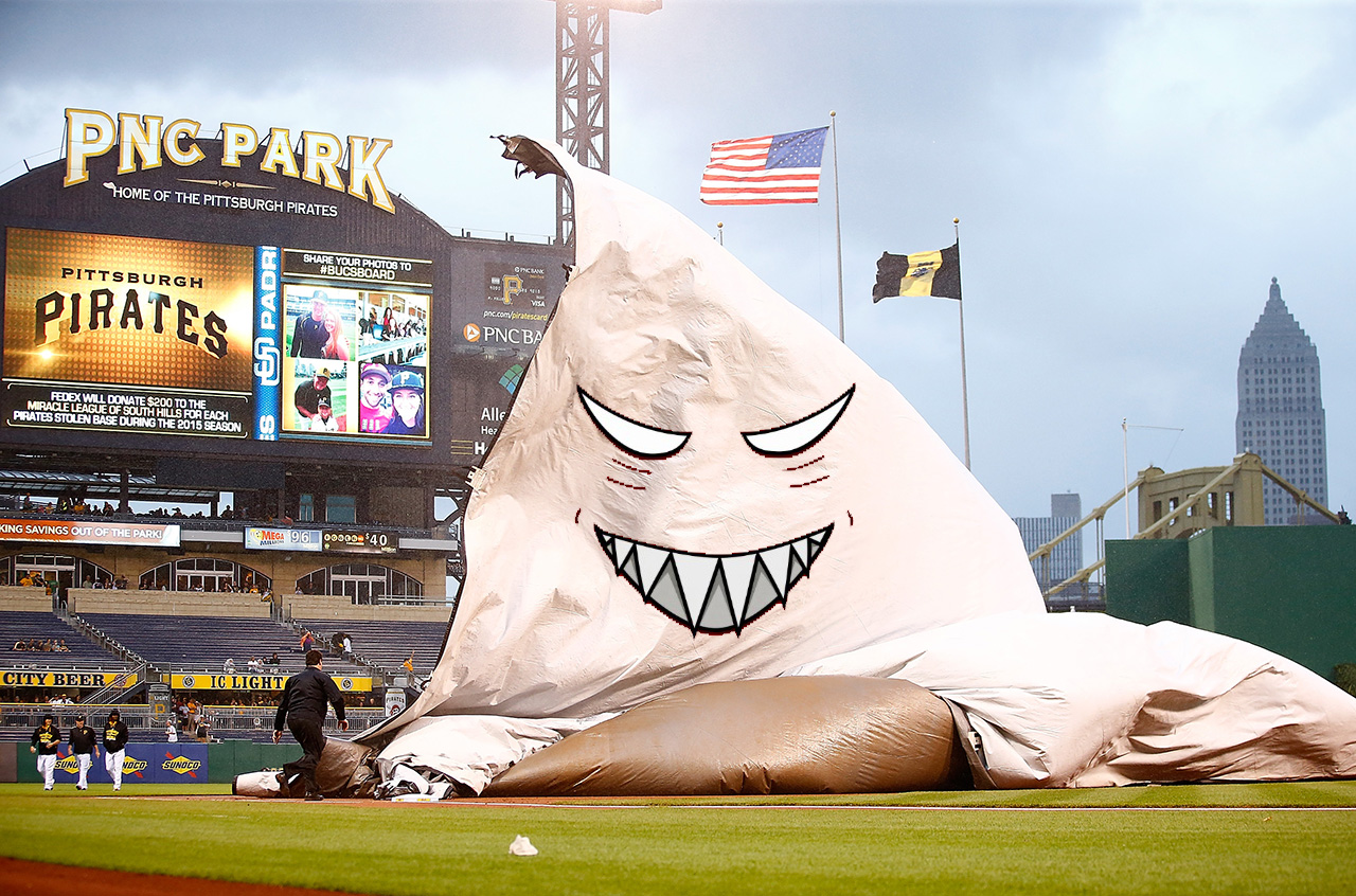 Une bonne pluie et de forts vents ont forcé l’interruption du match entre les Padres et les Pirates, hier soir, au PNC Park de Pittsburgh. Afin de garder le terrain au sec, les dizaines de préposés au terrain ont donc suivi leur procédure habituelle et ont rapidement essayé de dérouler la toile utilisée en cas d’intempérie.