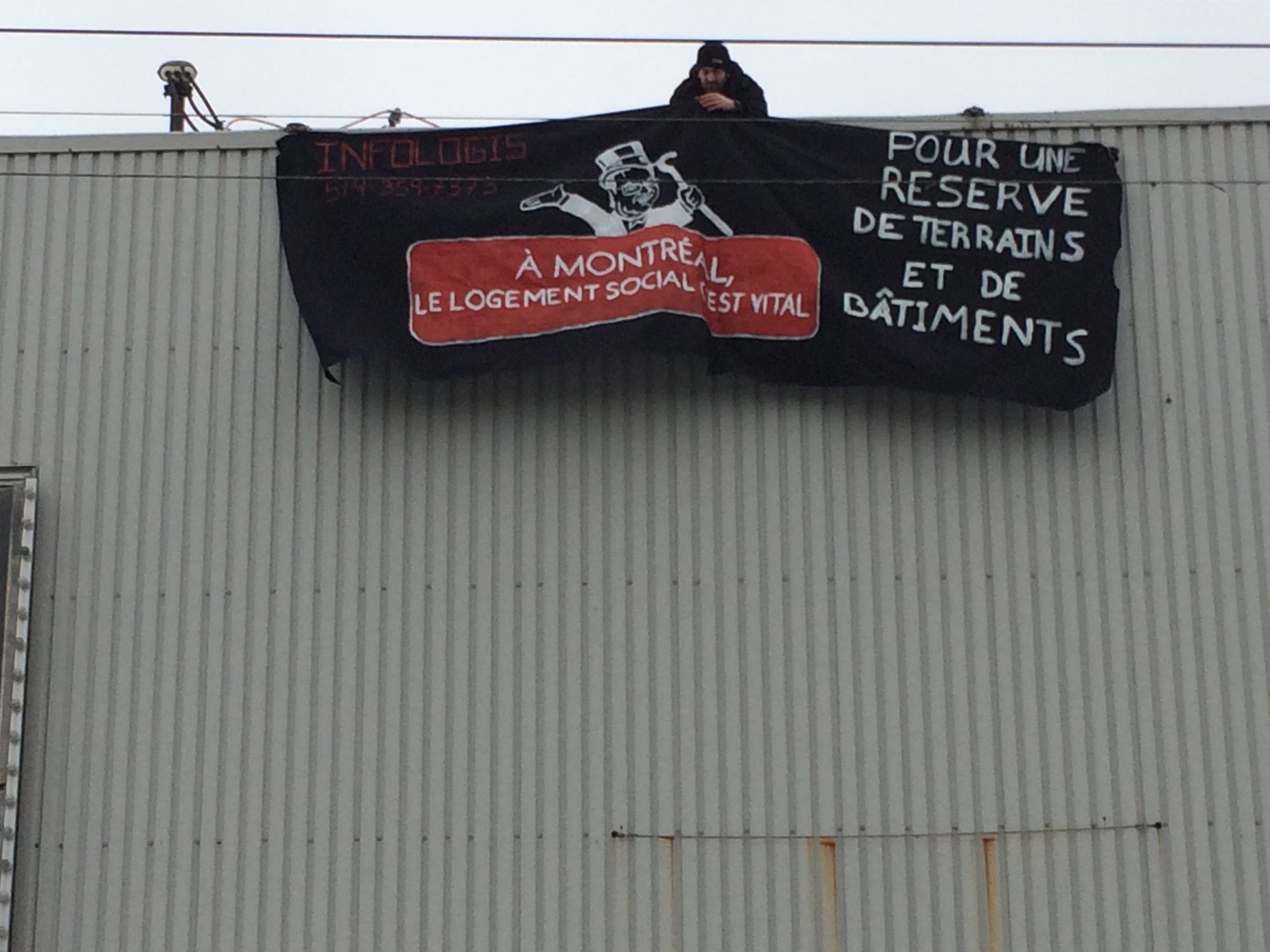 L’organisme souhaite que la Ville de Montréal acquière des terrains pour y construire des unités d’habitation sociale ainsi que des infrastructures collectives. Il a donc mené une action de sensibilisation, le 7 mars, en apposant une bannière sur l’ancien cinéma Paradis, bâtiment de la rue Hochelaga, voisin de la maison de la culture Mercier.