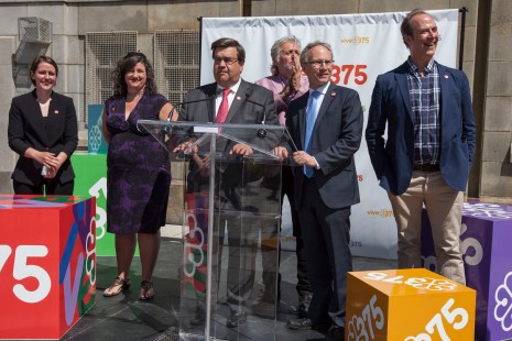 Le maire de Montréal, Denis Coderre, procédait au dévoilement des projets de quartier en compagnie du commissaire aux célébrations, Gilbert Rozon, et du ministre des Affaires municipales, Martin Coiteux.