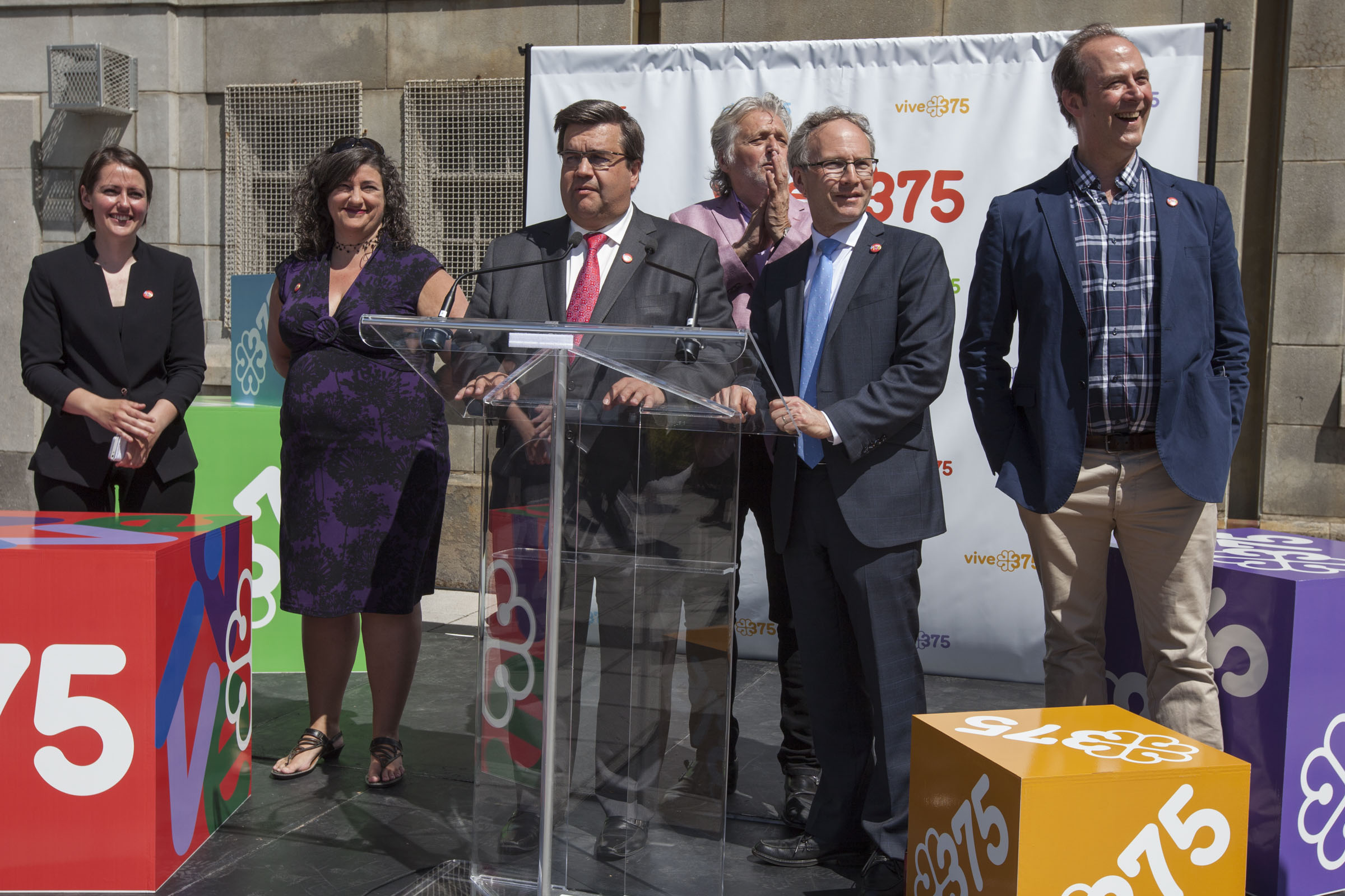 Le maire de Montréal, Denis Coderre, procédait au dévoilement des projets de quartier en compagnie du commissaire aux célébrations, Gilbert Rozon, et du ministre des Affaires municipales, Martin Coiteux.