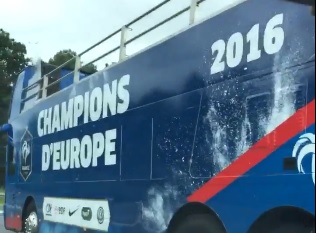 À l’approche du grand match, les équipes finalistes ont l’habitude de préparer des casquettes ou des T-shirts de champions mais…des autobus? Ça, je n’avais jamais vu ça de ma sainte vie. En fouinant un peu, on apprend que c’est l’autocar qui défilera dans les rues de Paris, ce soir, si la France parvient à prendre la mesure du Portugal.
